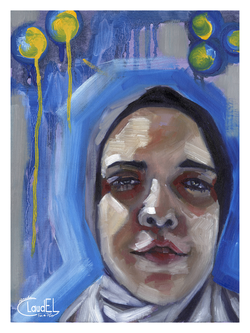 Natacha painted Aya to support her aim to tell the world about her story. Originally painted on an 12" x 16" loose canvas with striking, bold oil colors, this piece captures the depth of their plea.